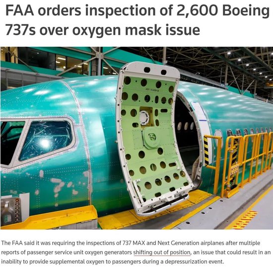 •美国联邦航空管理局7月8日表示,由于乘客氧气面罩可能在紧急情况下失灵,该机构要求对2600架波音737飞机进行检查。管理局称,该机构收到多份报告,称相关机型出现了乘客服务组件氧气发生器位移的问题。
